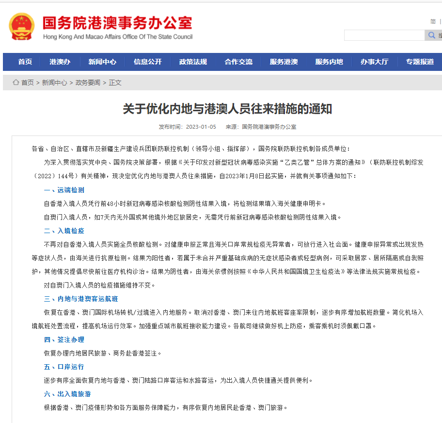 1月5日,國務院聯(lián)防聯(lián)控機制綜合組發(fā)布《關于優(yōu)化內地與港澳人員往來措施的通知》,自香港入境人員憑行前48小時新冠病毒感染核酸檢測陰性結果入境,將檢測結果填入海關健康申明卡。