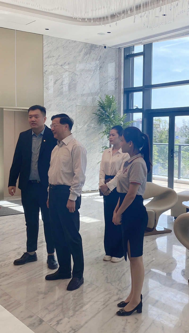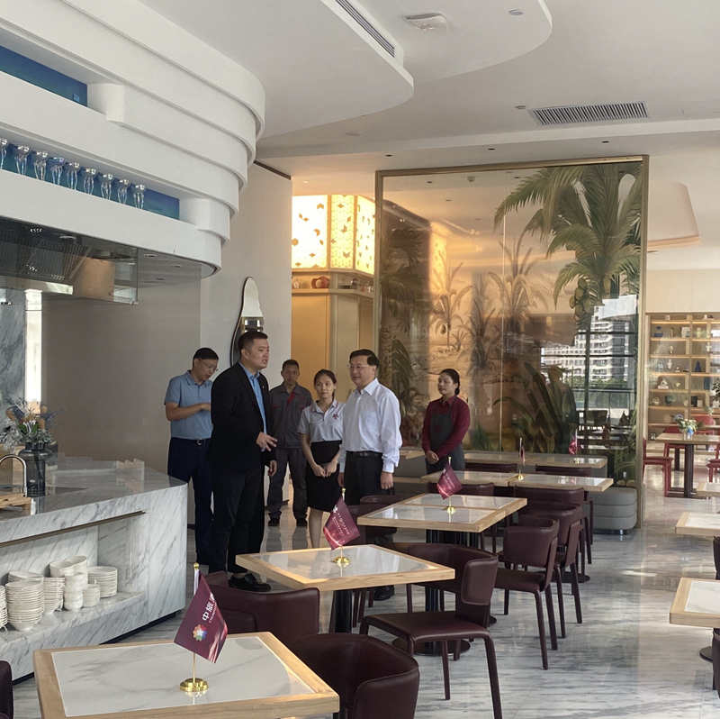 在中秋、國慶“雙節(jié)”將至的9月28日,??诿舛惓穷>熬频晗灿_業(yè)。9月29日中秋節(jié)當天,集團陳寅董事長赴海口免稅城睿景酒店考察調(diào)研。