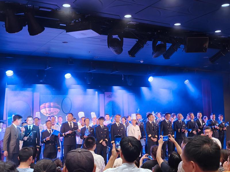 首航期間,“鼓浪嶼”號服務(wù)團(tuán)隊展現(xiàn)高度的敬業(yè)精神與專業(yè)素養(yǎng),在客房服務(wù)、餐飲服務(wù)及活動組織等環(huán)節(jié)中,始終保持熱情周到、細(xì)致入微,全力營造舒適安心的航行環(huán)境。在餐飲服務(wù)方面,為滿足不同乘客口味偏好,由經(jīng)驗豐富的馬來西亞大廚團(tuán)隊推出中西融合餐飲,自助餐廳分量充足、種類豐富。在互動體驗方面,為游客們準(zhǔn)備豐富精彩的娛樂、購物等活動,安排八段錦、武術(shù)講座、非遺節(jié)目、沉浸式劇目體驗(滬上綺夢)、DIY手工玫瑰、酒吧駐唱、電影播放等,cdf郵輪免稅店煥新開業(yè),推出多重促銷活動。在娛樂演藝方面,由國際頂尖娛樂團(tuán)隊特別為“鼓浪嶼”號傾力打造的主秀《絲路傳奇》和《霓裳馬戲秀》,掀起了與游客互動的高潮,獲得廣大游客的贊譽和好評。此外,為減輕海上風(fēng)浪造成的不適感,郵輪還為游客提供免費暈船藥和暈船貼,密切關(guān)注乘客需求,第一時間解決問題,受到客戶一致好評。