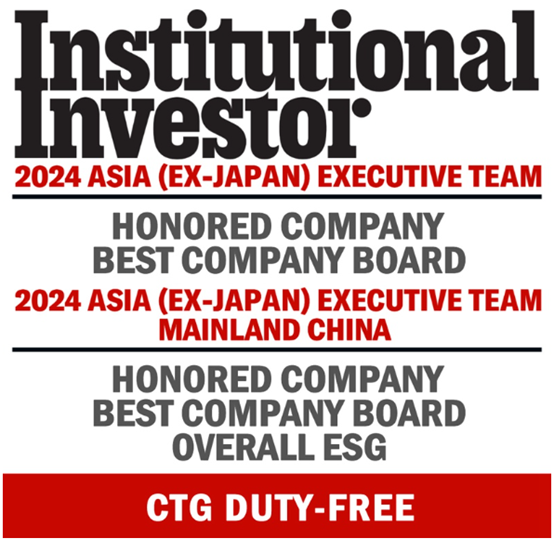 近日,國(guó)際權(quán)威金融雜志《Institutional Investor》公布了備受矚目的“2024年度亞洲最佳管理團(tuán)隊(duì)”評(píng)選結(jié)果。經(jīng)全球近6,000名基金經(jīng)理和分析師投票,中旅免稅榮登亞洲地區(qū)及中國(guó)大陸地區(qū)雙榜單,并在可選消費(fèi)品類別中榮膺多個(gè)重磅獎(jiǎng)項(xiàng):評(píng)選為“受尊崇企業(yè)”,榮獲“最佳董事會(huì)”(位列雙榜單第二名),“整體ESG表現(xiàn)”位列中國(guó)大陸地區(qū)榜單第三名。