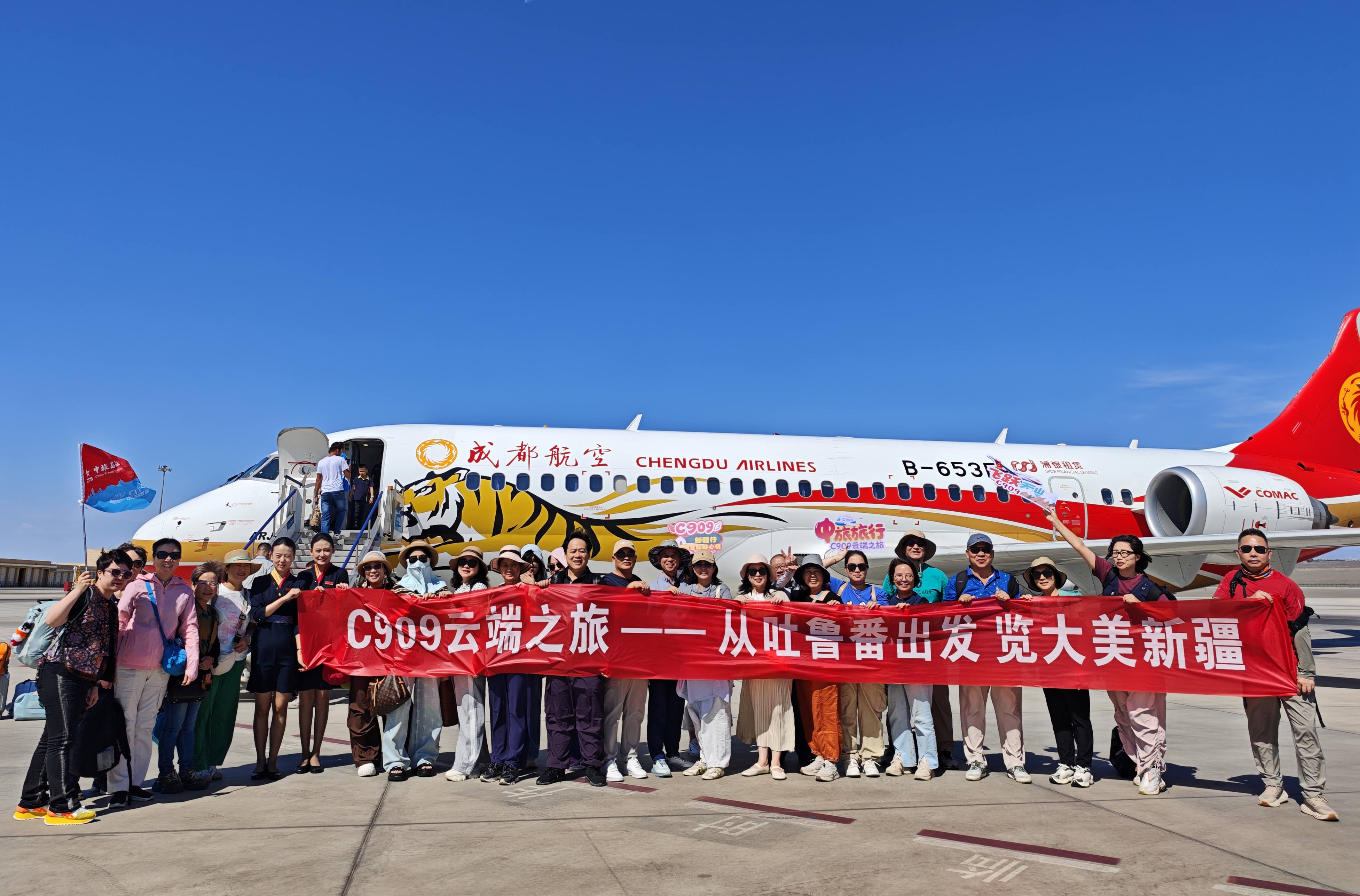 8月16日,由中旅旅行攜手中國商飛、成都航空共同策劃的“C909云端之旅”新疆旅游首發(fā)儀式在吐魯番市成功舉行。來自全國各地的27名旅客組成首發(fā)團,率先搭乘C909環(huán)疆快線,開啟“獨庫北疆4飛10日游”特色路線,成為“航空+文旅”創(chuàng)新模式的首批體驗者。