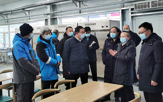 在中旅酒店冬奧項目組后勤保障組及餐飲組負(fù)責(zé)人的陪同下,嚴(yán)鵬程副省長及賈凱副部長視察了駐地環(huán)境、員工餐廳、員工宿舍及急救應(yīng)急配套設(shè)施。后勤保障組負(fù)責(zé)人就駐地選址、建設(shè)和功能配置情況進(jìn)行了綜合匯報,詳細(xì)介紹了團隊駐地關(guān)于紅綠區(qū)防疫管控要求的落實情況。