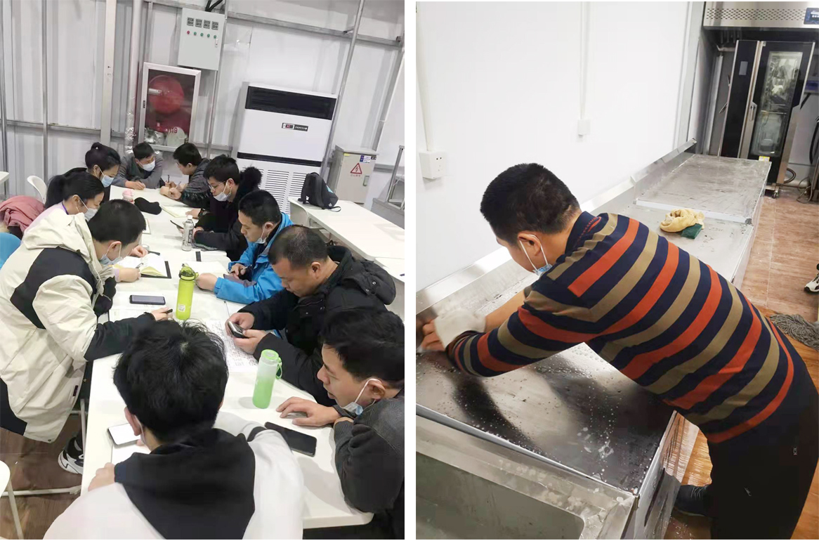 由于運(yùn)動(dòng)員餐廳對(duì)菜單要求非常高,我們幾個(gè)骨干就經(jīng)常以會(huì)代訓(xùn)進(jìn)行菜單培訓(xùn),討論需要的原材料,斟酌每道菜做法,測(cè)試菜品品質(zhì),查漏補(bǔ)缺、確定各種標(biāo)準(zhǔn)……目的只有一個(gè):讓參加冬奧會(huì)的運(yùn)動(dòng)健兒們享用新鮮、美味、可口又安全的“中國(guó)菜”。經(jīng)過一段時(shí)間的菜單培訓(xùn),餐廳和廚房終于可以開始布置了。原本清潔衛(wèi)生工作是分配給實(shí)習(xí)生的,但這時(shí)候廚房實(shí)習(xí)生還未進(jìn)村,我們廚房骨干和餐廳骨干共同承擔(dān)了衛(wèi)生清潔任務(wù),沒有抱怨,沒有偷懶,每天都保證廚房、餐廳是干凈衛(wèi)生、合格標(biāo)準(zhǔn)的。這也給后來進(jìn)村的實(shí)習(xí)生打了樣,他們現(xiàn)在打掃起衛(wèi)生來也是有模有樣,越來越標(biāo)準(zhǔn)了。