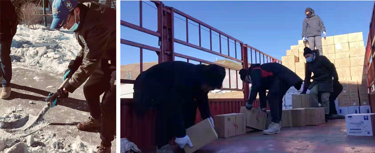 崇禮的冬天,比北京和山西老家都來的早、來的突然。一夜之間天寒地凍,一夜之間雪沒膝蓋。大雪后,大家一起清掃餐廳門口的積雪,開辟出道路,幾位年輕人邊掃雪邊哼唱著曲子,旭東感覺一下子回到了學(xué)校。有一天,在大貨車上卸貨時(shí),旭東的臉愣是被寒風(fēng)吹破?!耙?yàn)槭悄欠N十幾個(gè)輪子的貨車,必須要站上去卸貨,我和幾個(gè)同事在車上卸了一天的貨,然后我的臉就被吹傷了,溫度一高就疼?!彼貞浀溃骸按蠹叶己荜P(guān)心我,董湛哥給我找了嬰兒油,還給了我面膜讓我保護(hù)好自己?!倍炜梢愿?,但有愛就不怕,心也會(huì)更暖。