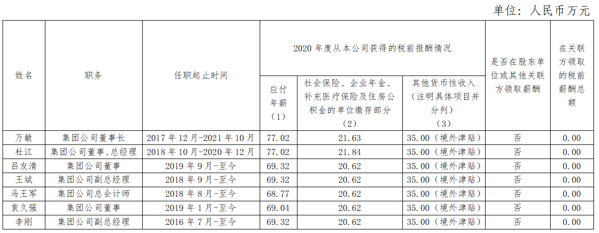 中國旅游集團(tuán)有限公司企業(yè)負(fù)責(zé)人2020年度薪酬情況