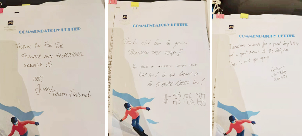 ——雪如意維景酒店接待來自9個國家的28位參加訓練周的外籍媒體人。外方人員離店前,紛紛寫下了感言,表達了對酒店精心服務的感謝。