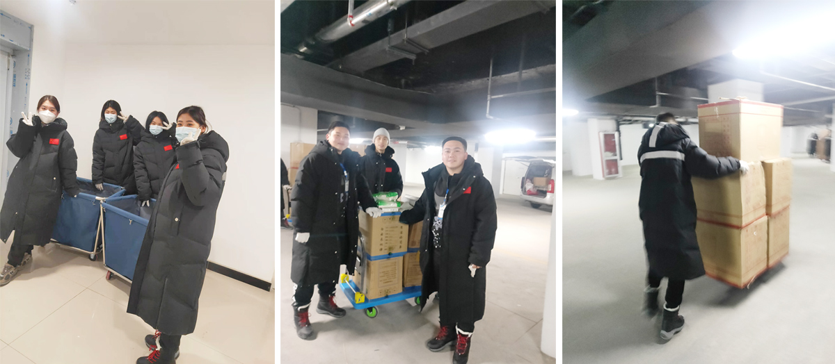為了12月21、22日全要素壓力測試,我們3號院要準備出178間可用房、215個床位。我?guī)е?名實習(xí)生,主要負責(zé)床上棉織品移入。棉織品開始都集中放在倉庫的,零下十幾度的溫度,我們用小拖車來來回回、反反復(fù)復(fù)的運送。