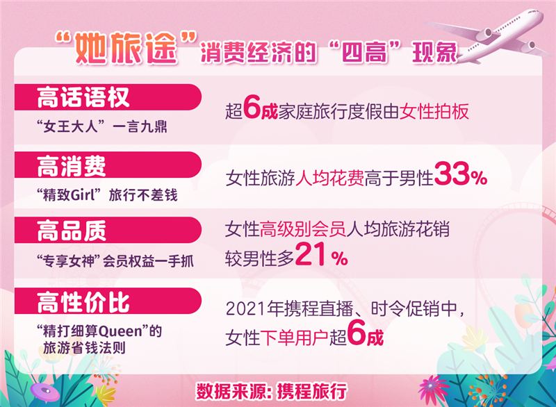 攜程發(fā)布女性旅游消費(fèi)報(bào)告:“三孩政策”下多孩旅游訂單增長22% 六成女性下單。露營、徒步女用戶占據(jù)半壁江山;“姐妹淘”戶外游增長76%。女性出游更舍得花錢 人均花費(fèi)比男性高33% 超四成入住高星酒店。舍得花也要花得值 逛直播間下單人群中女性占比62% 囤貨女神增長20%。愛自由行的阿姨媽媽呈雙位數(shù)增長 女游客最高年齡達(dá)91歲。攜程:新一線女性旅游人均消費(fèi)增幅超一線城市 鄂寧陜增幅排前三。六成家庭由“女王”拍板 高級別女會員旅游人均消費(fèi)超過同級男性21%。