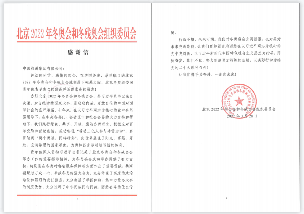 3月28日,北京2022年冬奧會和冬殘奧會組織委員會向集團發(fā)來感謝信,對集團表示衷心感謝并致以崇高的敬意。