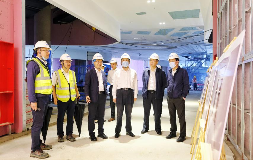 在項目地塊五施工現(xiàn)場,陳董實地查看施工進度、主題中庭效果展示和室內(nèi)精裝、幕墻樣板段,詳細了解選材用料和施工面臨的難點和問題。