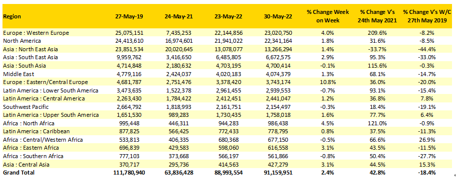 本周全球航空運(yùn)力再次突破9000萬個(gè)座位數(shù),達(dá)到9120萬。比上周增加了2.4%,新增了210萬個(gè)座位,這也是疫情以來單周最高的運(yùn)力值。這周運(yùn)力增長明顯的地區(qū)包括歐洲,該地區(qū)增長占據(jù)整體增量的一半以上,體現(xiàn)該地區(qū)休閑游需求的復(fù)蘇,今年夏季需求將充分恢復(fù)。
