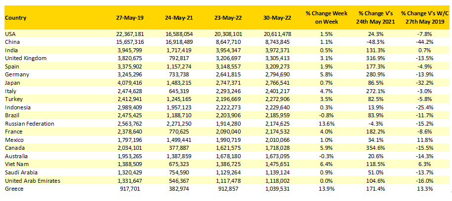 同比增長最快的是希臘,也正因此,希臘本周才得以躋身Top 20之列,將哥倫比亞擠出排行榜。本周希臘運(yùn)力環(huán)比增長13.9%,比疫情之前的水平高出13.3%。這對于希臘及其烏佐酒生產(chǎn)商而言是好事,因?yàn)檫@意味著有更多的游客將到訪希臘,哪怕機(jī)場要排起長龍。