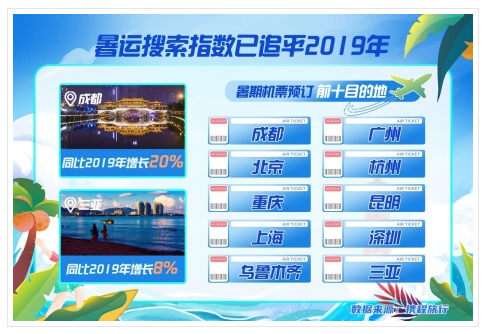 FlightAI數(shù)據(jù)顯示,暑期機票預(yù)訂排名靠前的目的地城市有:成都、廣州、北京、杭州、重慶、昆明、上海、深圳、烏魯木齊、三亞。排名第一的成都,暑期機票預(yù)訂量同比2019年增幅超過20%;除此之外,三亞游預(yù)訂量同比也有增長,增幅8%。